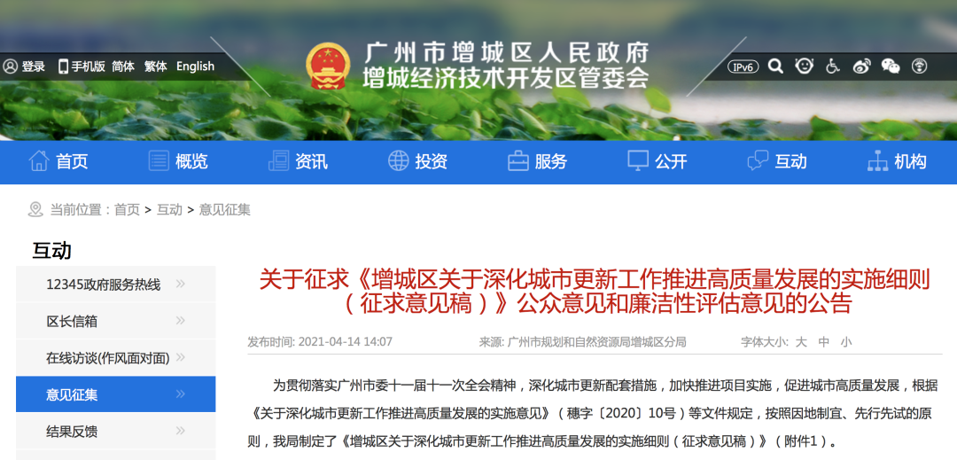2020年增城旧改招商成绩虽说是亮眼的,但是招商之后,就进入了长时间的“冷静期”。近日,增城区政府发布了关于征求《增城区关于深化城市更新工作推进高质量发展的实施细则(征求意见稿)》(下称《意见稿》)公众意见和廉洁性评估意见的公告。