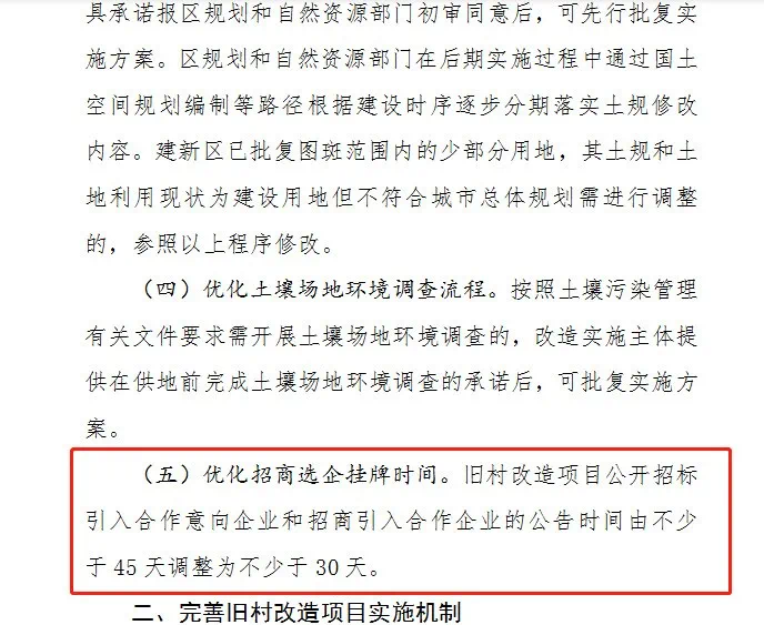 《意见稿》出台的背景是落实广州市委十一届十一次全会精神,深化城市更新配套措施,加快推进增城的旧村改造项目实施,促进城市高质量发展。意思就是,增城旧改按上了“加速器”了。下面和房产君一起来看看,这个《意见稿》说了些什么呢?总共有6大点,26条细则。总的来说就是一优化、二完善、三加快、四连片、五路径,简单一点,也可以用8个字来形容:快签!快批!快拆!快建!一、优化主要是优化旧村改造项目实施方案审核,简化5个方面的流程和审批。特别是招商环节,在增城原先的旧改政策中,招商选企挂牌公告的时间为“不少于45天”,在《意见稿》将公告时间更改为”不少于30天“,减少了15天,加快了招商的整体节奏。