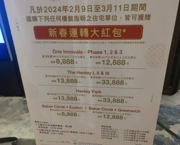 “针对内地过来买房的客户,我们提供VIP服务,包括专属VIP折扣,持内地有效居民身份证购房可享受额外3%折扣优惠;本月前三位内地购房者赠双人日本东京旅游礼券,总价值约18万港元等。”上述负责人表示。