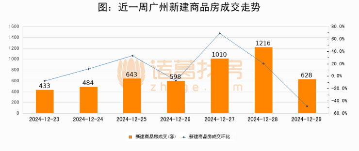 根据广州市住房和城乡建设局数据显示,2024年12月29日广州新建商品房成交628套,较昨日减少588套,环比下降48.4%