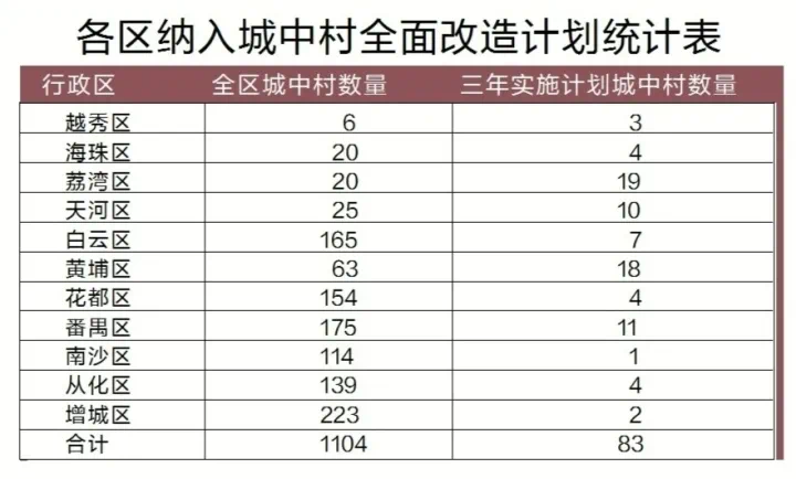 根据《广州市城市更新三年行动计划(2019-2021年)》,广州在三年内推进285个旧街区改造项目、176个旧厂房改造项目、83条城中村改造项目。