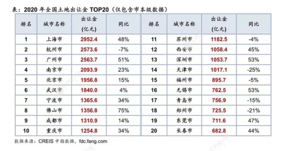 根据克尔瑞发布的年度报告,2020年,上海、杭州、广州、南京四市卖地收入超过2000亿,杭州、广州、南京等地的土地依赖度位居全国前列。