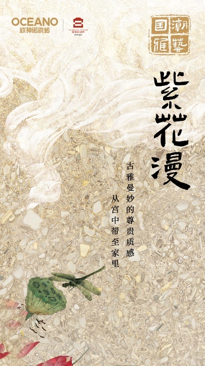 欧神诺2022国潮力作,境·宫——紫花漫系列,萃取花斑石的肌理质感、色彩细节,以花漫黄、花漫妃、花漫啡、花漫灰、竹丝灰、竹丝黑为代表,采用亮光深刻墨水、多重抛光、数码定位胶水干粒等工艺,打造色彩纯正、纹理图案逼真、细节丰富、充满高级质感的国潮精品瓷砖。