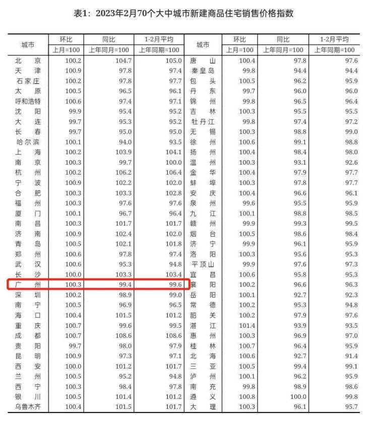 与北京、上海、深圳三个一线城市相比,广州商品住宅销售价格涨幅尚算居中。国家统计局城市司首席统计师绳国庆解读称,2月一线城市商品住宅销售价格环比上涨,一、二手房价格整体分别涨0.2%、0.7%。新建商品住宅方面,广州凭0.3%居涨幅之首;二手住宅方面,上海以1%的涨幅领先余下3市,北京次之,广、深随后。