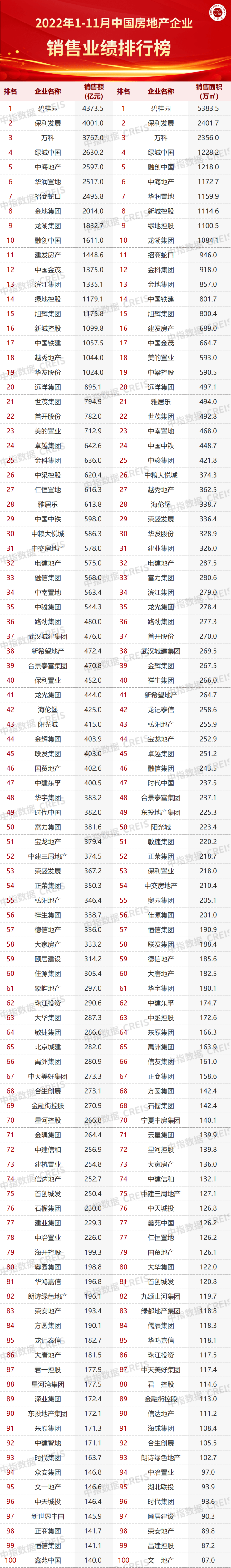 特别声明:房地产企业销售数据统计是以2022年1月1日-11月30日期间销售的并表商品房为统计口径,主要依据中指数据CREIS(点击查看)在各地的销售监测数据,并参考当期总体经营情况和推盘去化情况进行分析统计;对于少数没有在监测范围内的城市或项目,由企业提供相关证明文件,经课题组对数据进行严格审核,也纳入统计范围。本报告仅供参考,课题组不对使用报告及其内容所引发的任何直接或间接损失承担责任。