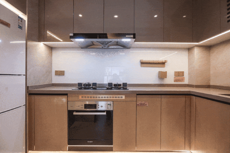 在配置方面,厨房三件套采用的均是源自德国的高端品牌——博世,包含油烟机、燃气灶和洗碗机,经过特意调配以更适合国内家庭使用习惯。比如油烟机不仅可以一键自动清洁,还能自动油脂分离,省去日常清洁;运行噪音仅为68.5分贝(国家标准为72分贝),既安静又省心;