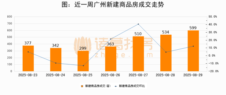 根据广州市住房和城乡建设局数据显示,2025年08月29日广州新建商品房成交599套,较昨日增加65套,环比上涨12.2%