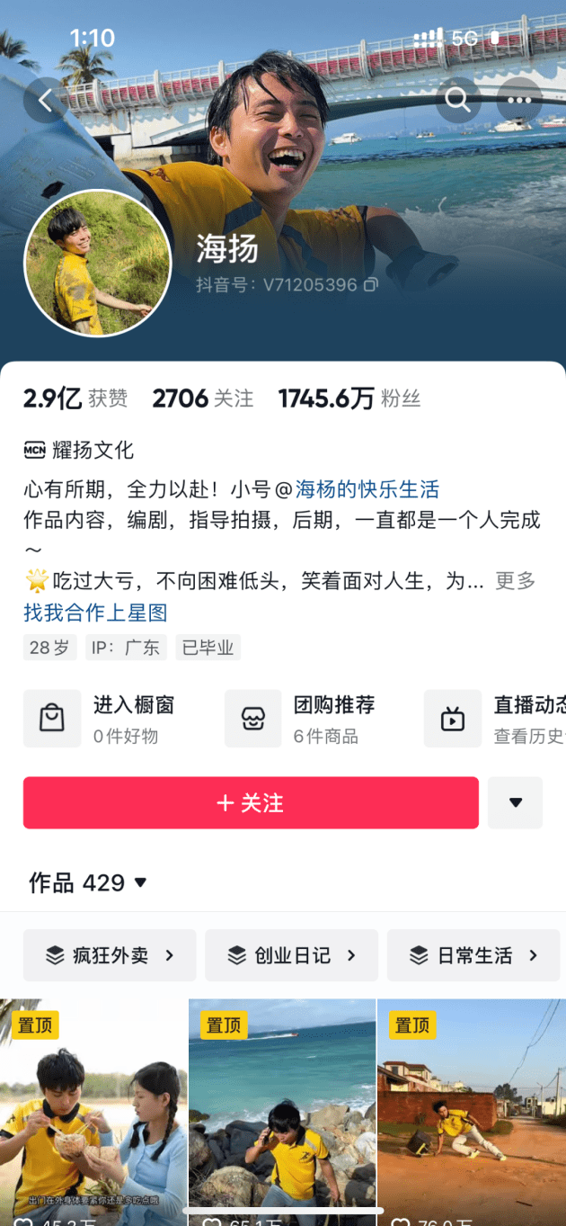 "海扬"作为一名抖音千万网红大咖达人,他在抖音上分享了很多关于生活、美食、旅行等等的内容,在他的视频中,我们可以看到他热爱生活是一种积极向上的生活态度,它意味着我们对生活充满热情和活力,积极地面对生活中的挑战和困难,享受生活中的美好和快乐。