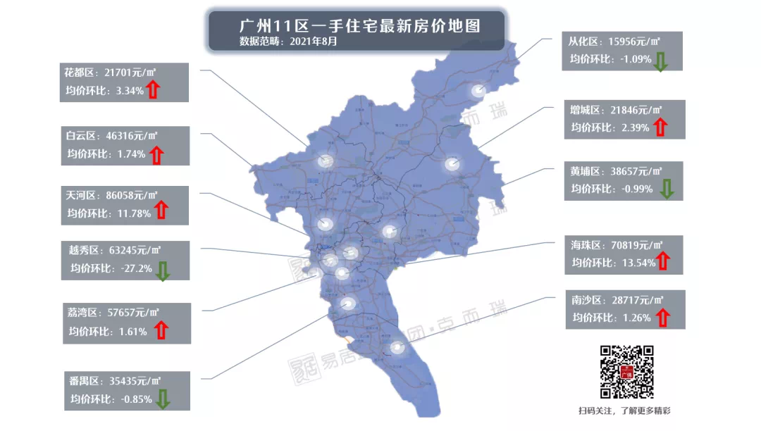 另外,从一手网签均价看,8月份广州一手住宅均价达32754元/㎡,环比下跌3.64%!而这已是广州一手均价的三连跌,可以说一手均价的一跌再跌,与政策调控的备案价下调、楼市降温的步伐一致。
