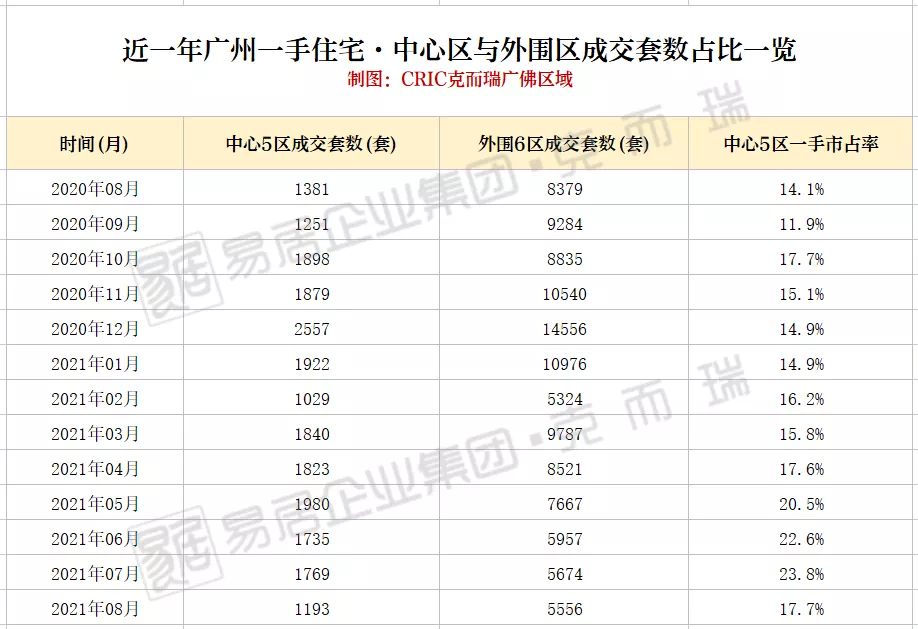 众所周知,中心5区的一手住宅价格偏高,因此中心区的网签成交占比往往能够影响平均值的高低。克而瑞数据显示,2021年8月份中心5区一手住宅网签成交仅1193套,同比减少13.61%、环比减少32.56%!用另外的一个对比,更加直白;中心5区8月份的成交套数,仅比今年2月春节月多164套。通过计算中心与外围的成交占比,发现8月份中心5区的一手成交占比仅达到17.7%,较6月份市场下降了近5个百分点。这亦是套均价下滑45万元的缘由之一。