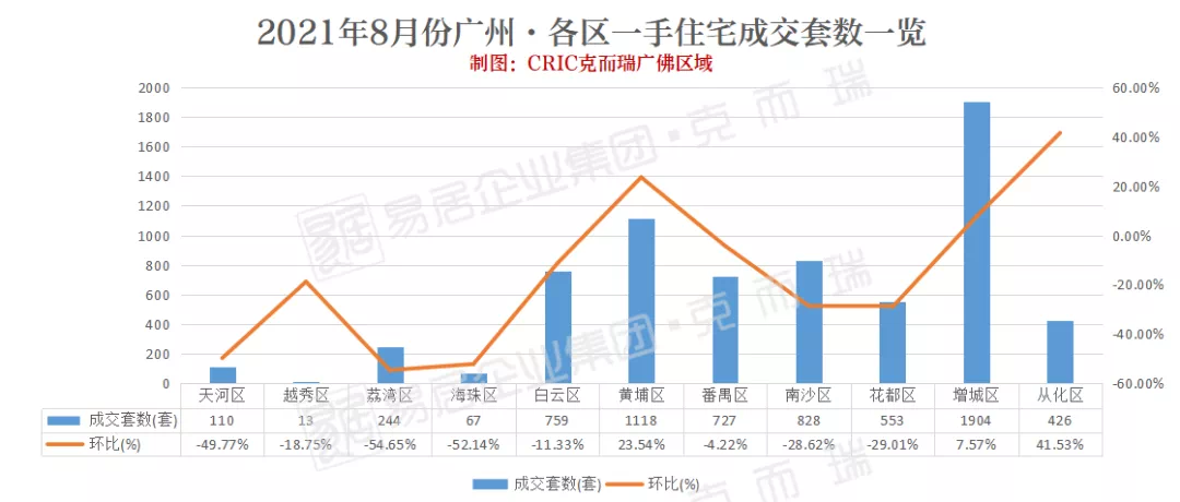 具体到各个行政区域,广州11区中合计8个片区一手市场网签成交套数环比下滑,其中天河区、荔湾区和海珠区成交量环比下滑最多,分别下滑了49.77%、54.65%以及52.14%。
