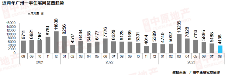 由于8月未有实际刺激性政策落地,开发商、买家处于观望状态,8月广州一手住宅成交出现明显下滑,成交跌至2023年1月至今低位。