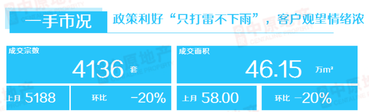 除传统淡季因素以外,不少客户认为官方将会出台市场利好政策,因此抱着等待、观望心态暂缓入市,导致市场成交大幅下滑,创2023年以来月度新低。