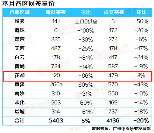 细分到各区,仅花都一区实现环比微涨,同时成交宗数排到全区前五,表现尚可。