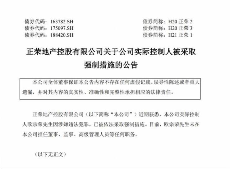 1月20日,正荣地产控股有限公司发布公告,近期获悉,公司实际控制人欧宗荣因涉嫌违法犯罪,已被依法采取强制措施。目前,欧宗荣未在公司担任董事、监事、高级管理人员等任何职务。