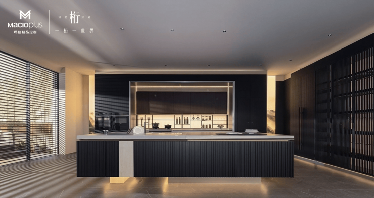 ·西厨 不锈钢台面倒映着半透格栅门的几何之美,深灰柜体与胡桃木色在智能灯光下形成材质交响,宋代“煮酒”的雅趣自然流淌。
