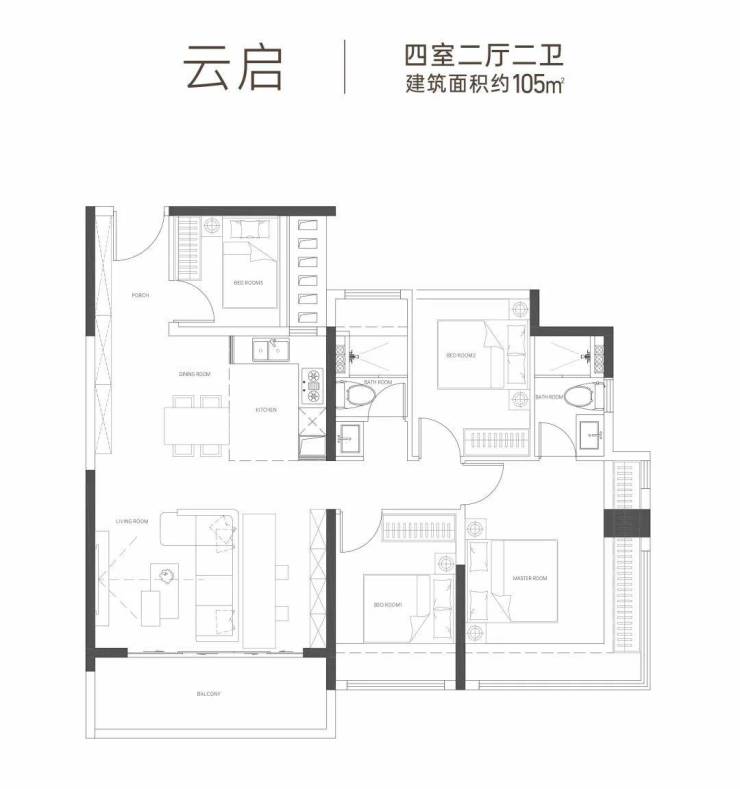 建面105㎡四房两卫户型也是采用大面宽采光,视野开阔;餐客厅阳台一体化,生活排场一字铺开;入门还有一个创意空间,可打造成书房、游戏房、储藏室等,生活灵动百变。