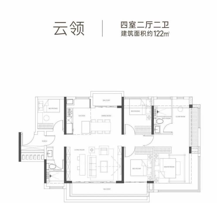 建面122㎡四房两卫户型颇具大宅风范,超大宽境开间客厅,纵享家人欢聚时刻;奢阔主人房配备独立卫浴、衣帽间,享阔尺私属空间;四房格局,不管是二胎家庭还是三代同堂都能轻松安置。