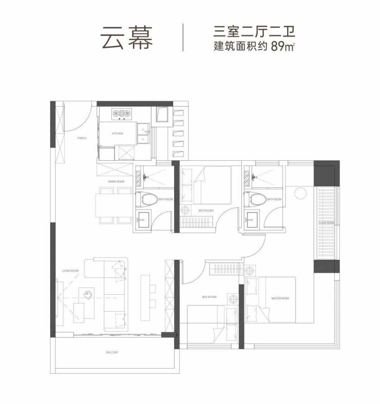建面89㎡三房两卫户型就很哇塞了,采用当下最流行的LDK一体化,空间开阔连贯,而且客厅开间做到了5米,相当于市面上100多方户型的客厅开间。