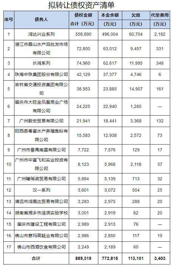 广州农商银行拟转让债权资产清单共计 17 项,债权金额总计 88.93 亿元,本金余额 77.28 亿元,欠息 11.31 亿元,代垫费用 3403 万元。