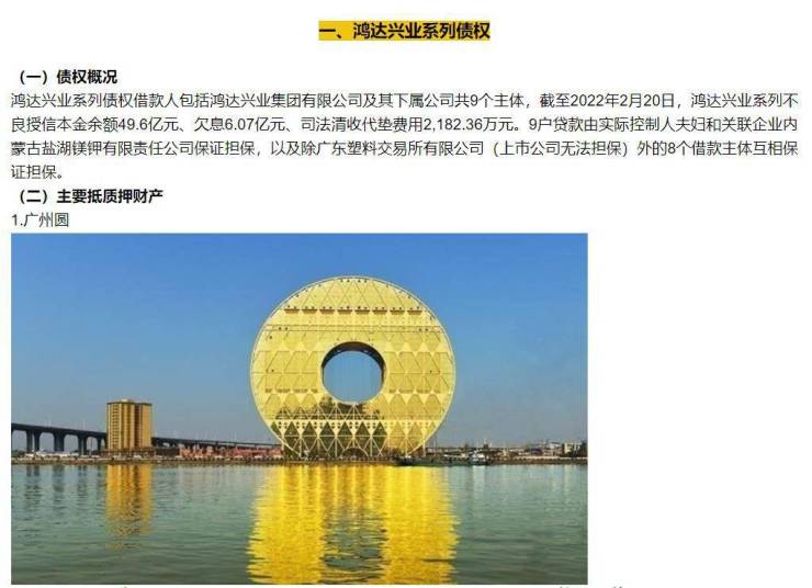 在清单中,位列清单排名前列的较大债权人是鸿达兴业系列,债权金额总计 55.88 亿元,对应的抵押物就是广州圆大厦。