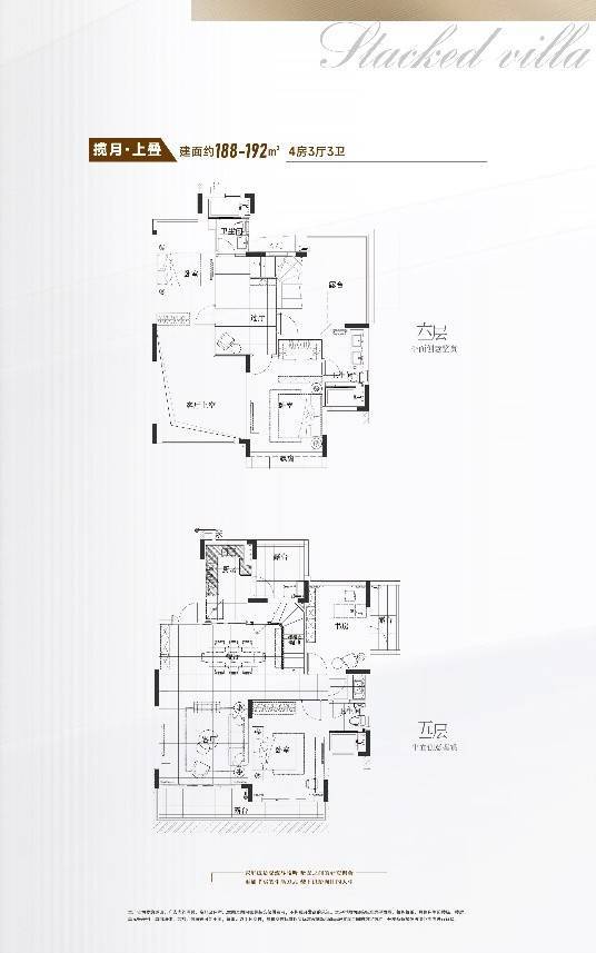 户型为188-192㎡四房三厅三卫,拥有约35.48㎡的巨幕景观阳台,集阳光、美景于一体,既能种花养草、乘凉静思,又能感受云卷云舒、日升月落的自然之美;二层起居空间为套房设计,配备全景落地飘窗、独立衣帽间和卫浴,打造专属、优雅的居住体验。