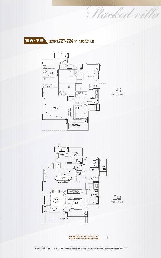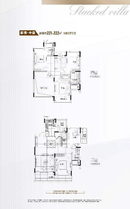 中叠为221-222㎡五房三厅三卫,设有高约6.3米挑空空间、LDK 客餐厅一体化布局,其中涵盖面积约57㎡的轩阔长厅,实现优化家居动线、提升通透性、增加家庭互动性等功能升级;二楼设有三房两卫,可作为老人套房和儿童套房,使三代人的生活既有交融、又保持独立,即增加私密性、又能阖家享受天伦之乐。