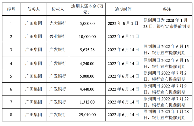 6月16日晚间,广田集团(002482.SZ)公告称,深圳广田集团股份有限公司受排名前列大客户恒大集团债务危机影响,公司应收账款周转缓慢,公司近期因流动资金紧张出现部分银行债务逾期的情形,除前期已披露债务逾期情况外,截至本公告披露日,新增逾期本金合计7.1亿元。广田集团称,公司将持续与上述银行积极协商,并加强应收账款催收工作,妥善处理相关银行债务逾期事项。但广田集团强调,公司可能会面临需支付相关违约金、滞纳金和罚息等情况,导致公司财务费用增加,进而对公司本期利润或期后利润产生一定的影响。同时债务逾期事项可能导致公司融资能力下降,进一步加剧公司的资金紧张状况。此外,公司可能因上述债务逾期面临诉讼、仲裁、银行账户被冻结、资产被查封等风险。
