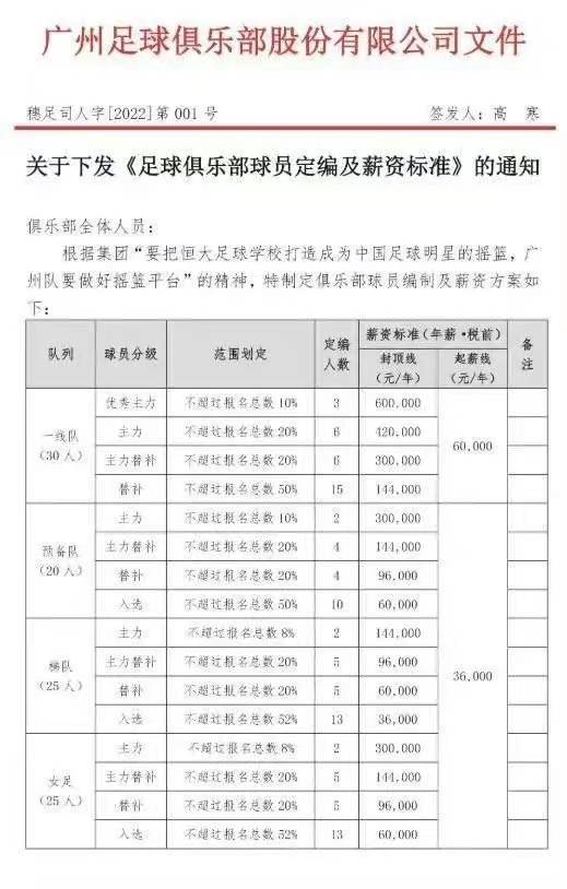 不过在2月16日,市场流出一分广州足球队俱乐部红头文件,确定俱乐部球员较新薪资标准。在文件中,一线主力球员(30人)底薪是6万元/年,较高封顶60万元/年。