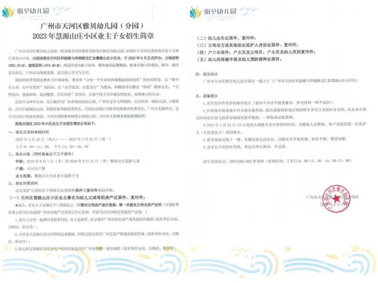 慧源山庄配套的幼儿园,为天河区雅贝幼儿园,一所隶属天河区教育局的全日制公办幼儿园。今年9月正式开办,慧源山庄业主在小区可享受目送式教学,家长无需担心子女的教育问题。
