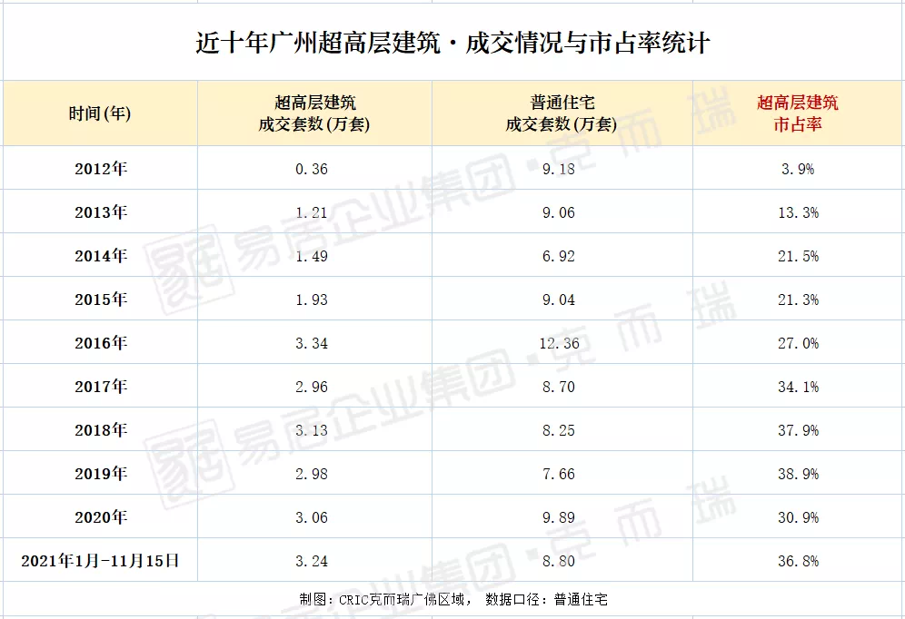 为此,小编选取了2012年-2021年,十年间的广州市场数据,定向筛选口径仅普通住宅+超高层建筑(别墅不计):【备注:超高层范围的网签成交是计入整一栋楼的成交量】克而瑞数据显示,在2012年-2021年(截至11月15日),广州一手住宅总计网签成交23.7万套超高层楼栋单位,成交面积总计2523.74万㎡。