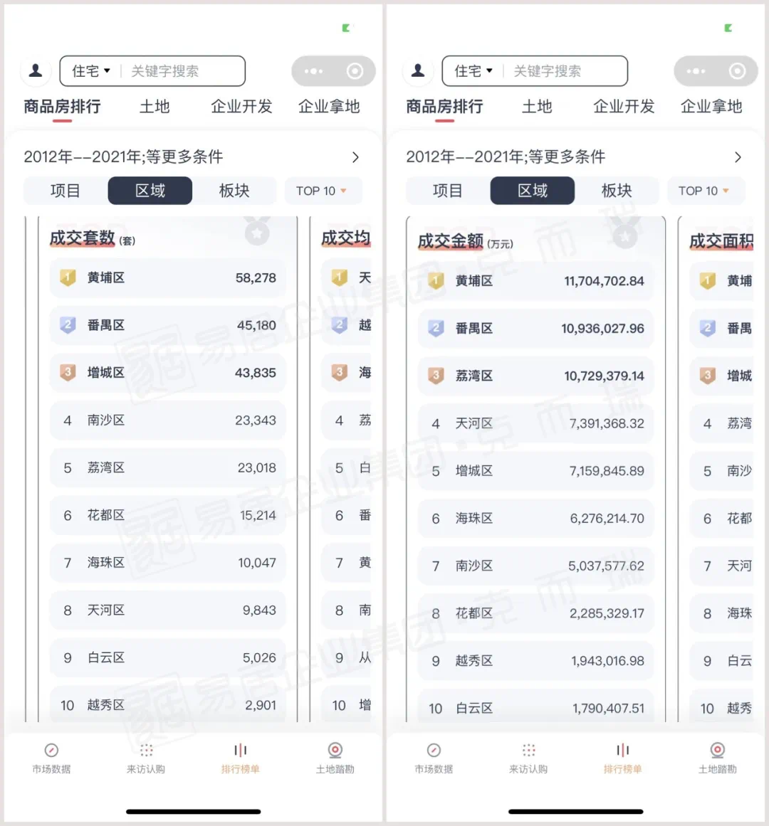 而随着市中心的可利用土地减少,摩天大楼也迅速向广州的外围区域扩张,进一步实现了各区土地资源的规划应用,均衡发展;据监测十年期间,广州热门的外围区域,一栋栋云雾缭绕的超高层摩天大楼如雨后春笋般不断涌现;由克而瑞·广佛小C小程序显示到,2012-2021年期间“超高层建筑”网签成交排名前三的,分别是黄埔区5.8万套,番禺区4.5万套以及增城区4.4万套;据克而瑞统计,在盛行超高层建筑的黄埔区,中海誉城以6360套超高层建筑网签成交,排名区域排名前列;万科幸福誉(5785套)、万科东荟城(3493套)紧随其后。
