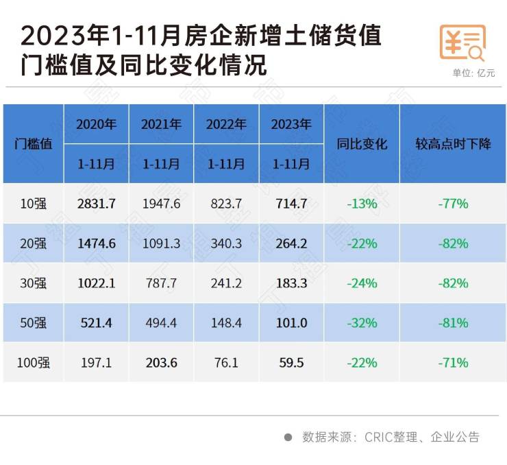 克而瑞数据显示,前11月新增货值百强门槛为59.5亿元,同比下降22%。