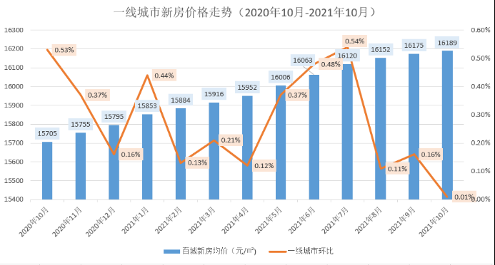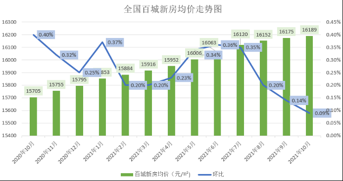 数据显示,2021年10月,全国100个城市新建住宅平均价格为16189 元/平方米,环比上涨0.09%。