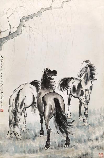 本次真迹画展的压轴,琶洲·樾臻选了被众人称为艺术市场的“龙头股”——徐悲鸿的《三马图》。徐悲鸿被称为中国现代美术教育的奠基者,在国内外享有一代宗师的盛誉。在2010年的春季拍卖会上,徐悲鸿作品总成交率高达84%,总成交额达到了4.458亿元。徐悲鸿所作国画彩墨浑成,尤以奔马享名于世,在2014年中国嘉德秋季拍卖会,徐悲鸿的《奔马》以2127.5万元成交,均价高达150万一平尺!