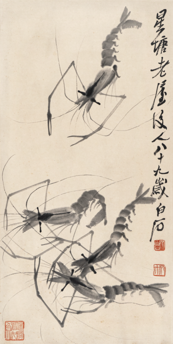 在花鸟写意类真迹作品中,有“当今画梅第一人”关山月带来的《报春图》。当然也少不了齐白石画的“虾”,“虾”是齐白石钟爱的题材,通过长期的临摹和写生,在画虾的技法上不断探索,最终铸锻了其自成一家的画虾风格,开创了一种新的绘画样式。其中最出名的《鱼虾蟹蛙》联体作品,寥寥50几笔,估价超过8.7个亿,算下来一笔就要值1700万!