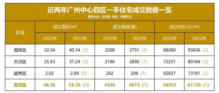 克而瑞数据显示,相对比2022年,2023年海珠、天河、越秀、荔湾中心四区一手住宅成交面积、套数均双双上涨。