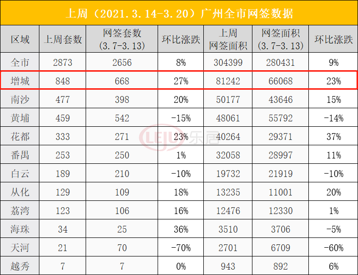 至于各区方面,黄埔、南沙、增城仍旧是广州较大的成交地区。其中,增城网签848套继续霸占榜首,比前一周多成交180套,环比涨27%。