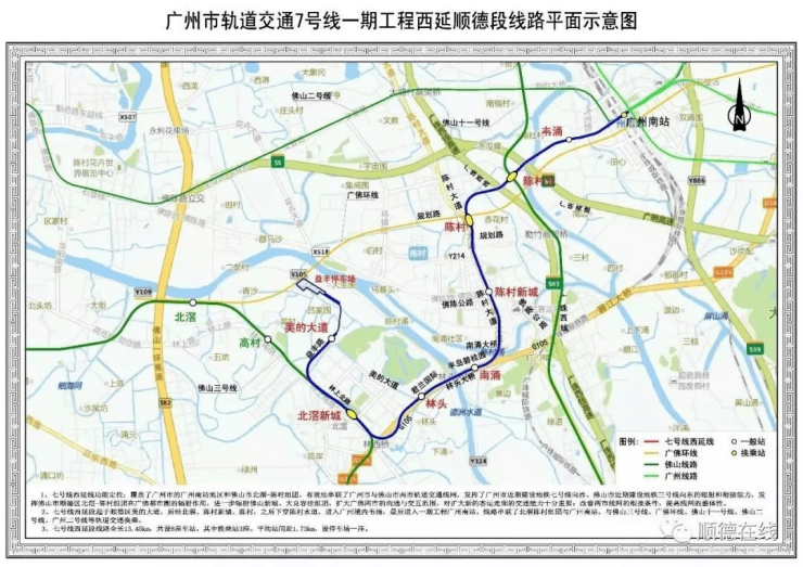 7号线西延段全长13.4公里,其中顺德区段长约11.8公里,广州区段长约1.6公里,共设8座地下站,分别为美的大道、北滘公园、美的、南涌、锦龙、陈村、陈村北、大洲,其中北滘公园未来与佛山3号线换乘,陈村与城际铁路广佛环线换乘,陈村北未来与佛山11号线换乘。