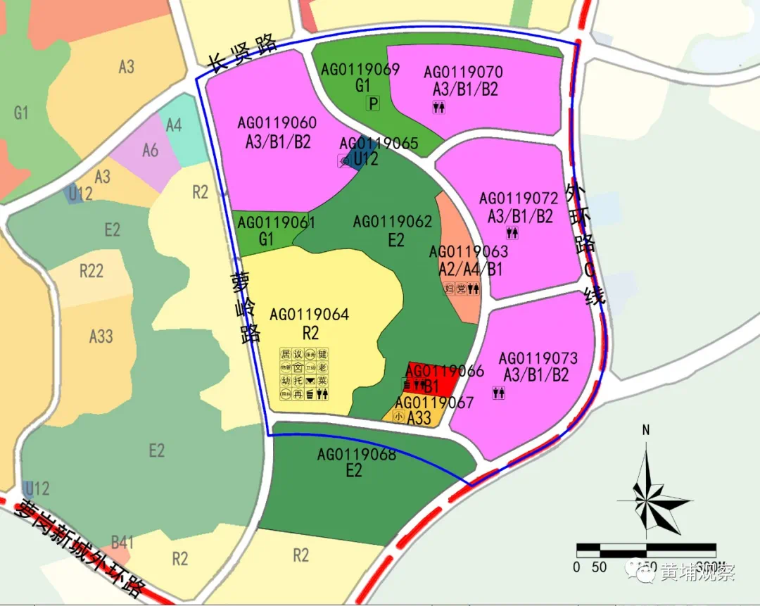 其中,萝岗街一宗,位于开萝大道以北、广惠高速以南(见下图);另外两宗在长岭居外环路C线以西、萝岭路以东,岭南林语以南:CPPQ-A4-2地块与CPPQ-A4-3地块。