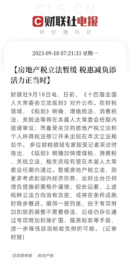 9月18日,财联社发布消息称,日前《十四届全国人大常委会立法规划》对外公布,备受关注的房地产税立法和个人所得税法修订并未出现在本次立法规划中。