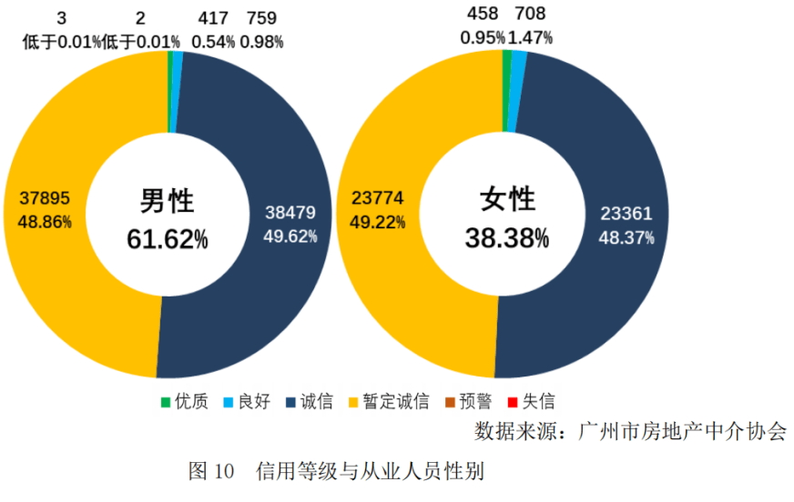 这意味着,地产界守信用的中介人员至少达到12.6万人。其中,男性与女性分别有 77555 人和 48301 人,超过六成以上的中介人员是男性。