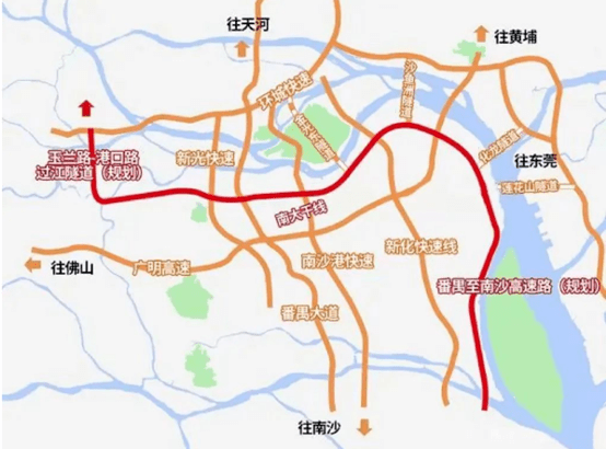 南大干线为广州市、区共建的重点项目,采用城市快速路设计标准,项目西起南站片区钟三路,可通过番海大桥连接佛山市,全线东西向贯穿番禺区北部,东接莲花大道,远期可继续与规划东部快速通道衔接实现向南沙区的延伸。
