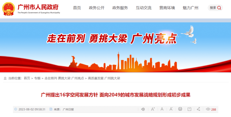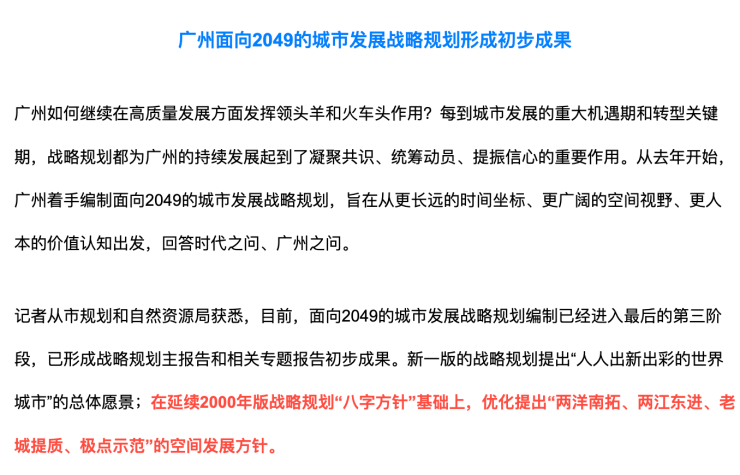 重磅!今日,广州市人民政府发布了一篇名为“广州提出16字空间发展方针 面向2049的城市发展战略规划形成初步成果”的文章。