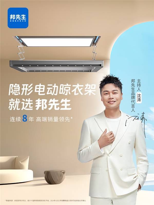 5月11日,邦先生宣布,与浙江卫视知名主持人沈涛达成合作,正式官宣其为品牌代言人。此次携手,立足于邦先生高端品牌形象力原点,王牌明星力协同共创,共话智能晾晒“美好生活”故事。