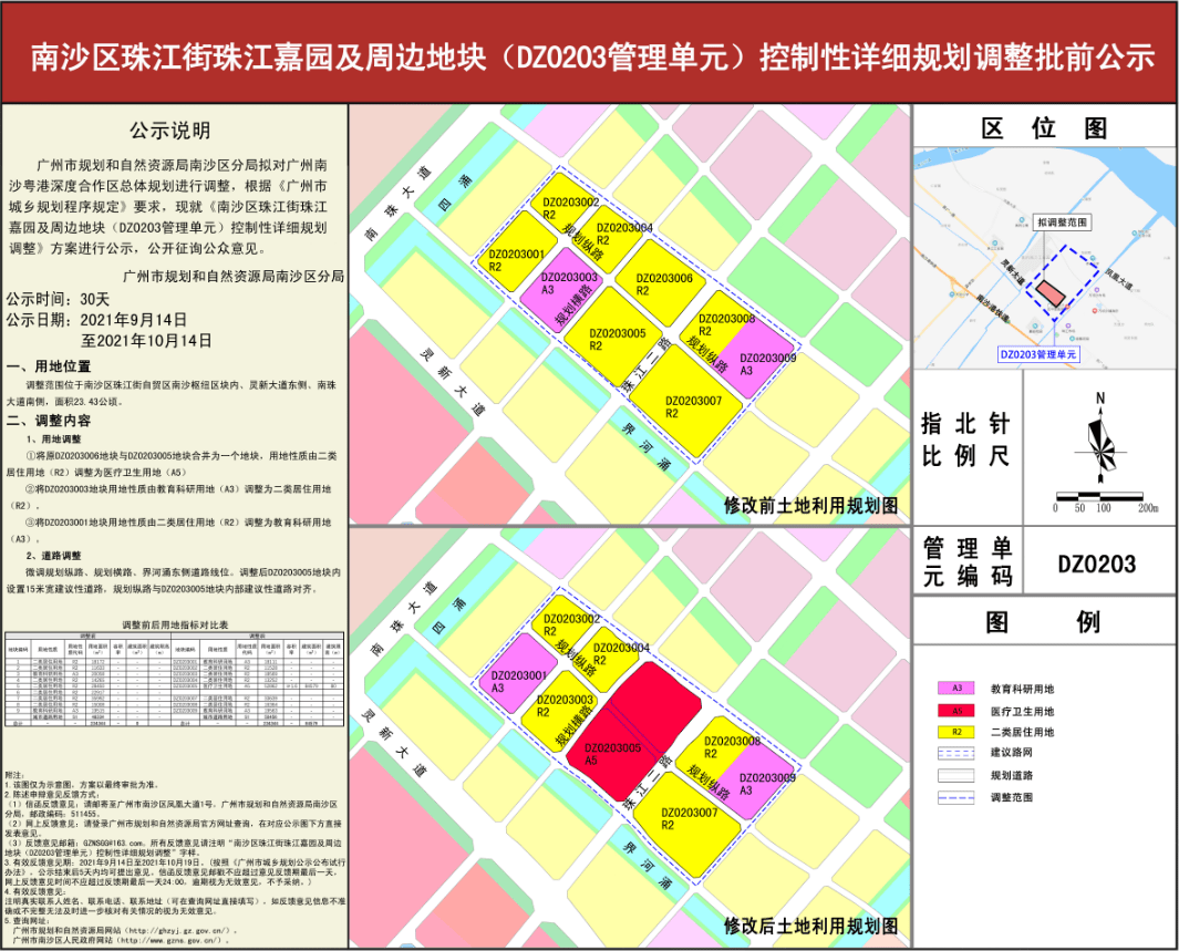 据9月14日发布的《南沙区珠江街珠江嘉园及周边地块(DZ0203管理单元)控制性详细规划调整批前公示》,广州市规划和自然资源局南沙区分局拟对广州南沙粤港深度合作区总体规划进行调整,调整范围位于南沙区珠江街自贸区南沙枢纽区块内、灵新大道东侧、南珠大道南侧,面积23.43公顷,将原DZ0203006地块与DZ0203005地块合并为一个地块,用地性质由二类居住用地调整为医疗卫生用地。