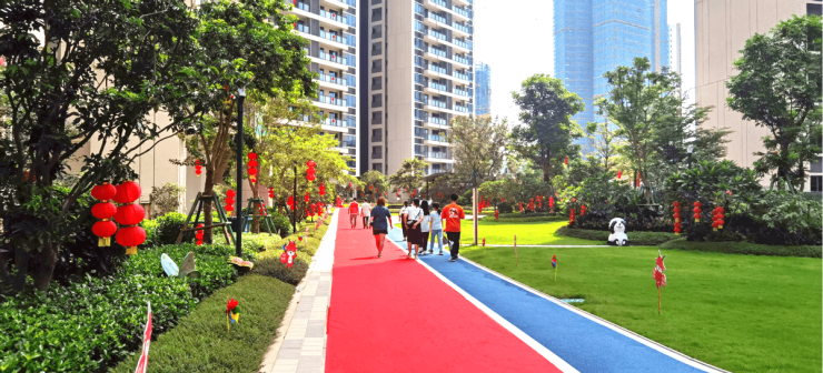交付现场,干净整洁的园区道路铺上了喜庆的红毯,延伸至交付的楼栋,迎面而来的暖心敏羊羊指引、交付标语、灯笼风车等装饰,让归家之路充满了仪式感,引导着业主奔向家的方向。