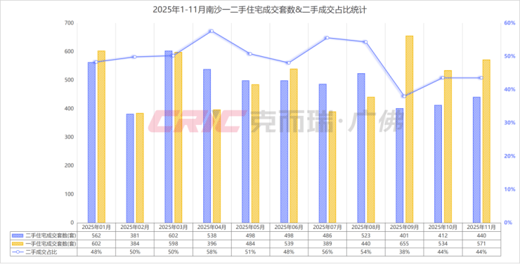 克而瑞数据监测显示,2025年1-11月南沙二手房成交面积57.25万㎡,较去年全年增长2%,为近六年来的最高峰。