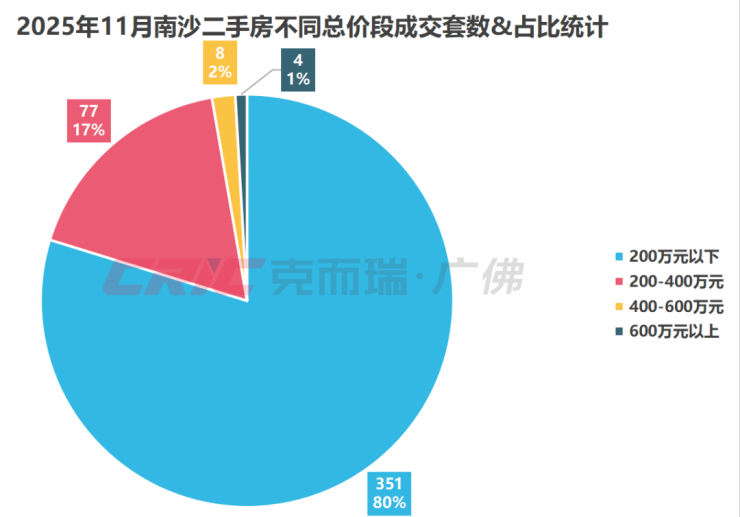 克而瑞数据监测显示,11月南沙二手房成交均价15437元/㎡,按照总价段划分,总价200万元以下二手房成交351套,占比达到了80%,环比上月扩大6%。