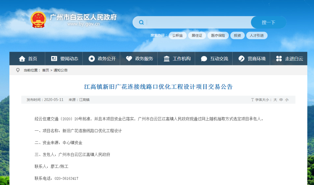 近日,广州白云区政府网发布了《江高镇新旧广花连接线路口优化工程设计项目交易公告》。